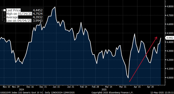 Markets welcomed the news. Equities have rebounded since President Donald Trump began walking back tariff threats and offering concessions. However, strain lingers in the bond market. Yields on 10-year U.S. Treasuries have climbed back to +4.5%, highlighting persistent concerns around long-term fiscal sustainability. Unlike short-term rates, which the Federal Reserve can manage, longer-term yields are shaped by inflation expectations and fiscal credibility—particularly important in a country carrying growing debt burdens.
