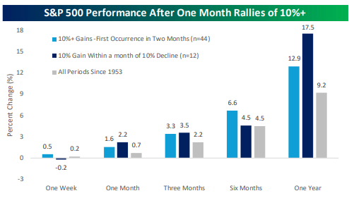 The data backs this up (see table above). Since 1953, following one-month gains of +10% or more—or such gains occurring within a month of a 10%+ decline—the S&P 500 has historically continued to post solid returns over the following weeks and months. Charts on the next page show median returns and the frequency of positive outcomes in the 1-week, 1-month, 3-month, 6-month, and 12-month periods that followed.