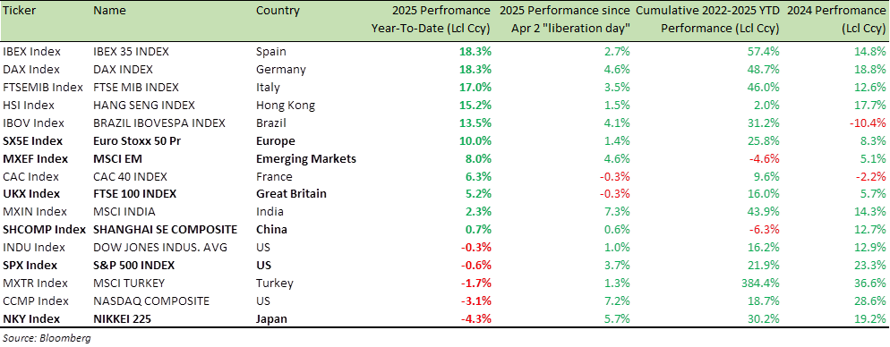 Global Equity Index Performance (2025 performance YTD, since Apr 2 “Liberation Day”, 2022-2025 YTD and 2024)