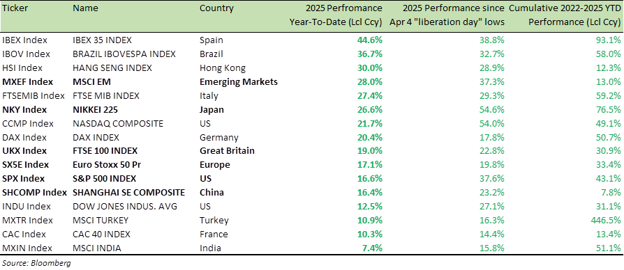 Global Equity Index Performance (2025 YTD, since April 4 YTD and 2022-25 YTD)