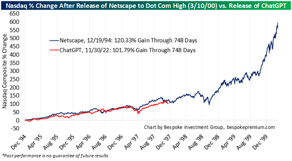 At the economy level, the US economy remains supported by strong earnings, pro-growth policies, active capital markets, and ongoing AI investment—benefits that are likely to ripple across global sectors. The major AI stock rally may still be ahead, potentially mirroring the trajectory of Netscape’s 1994 launch. So far, the pattern is strikingly similar (chart below).